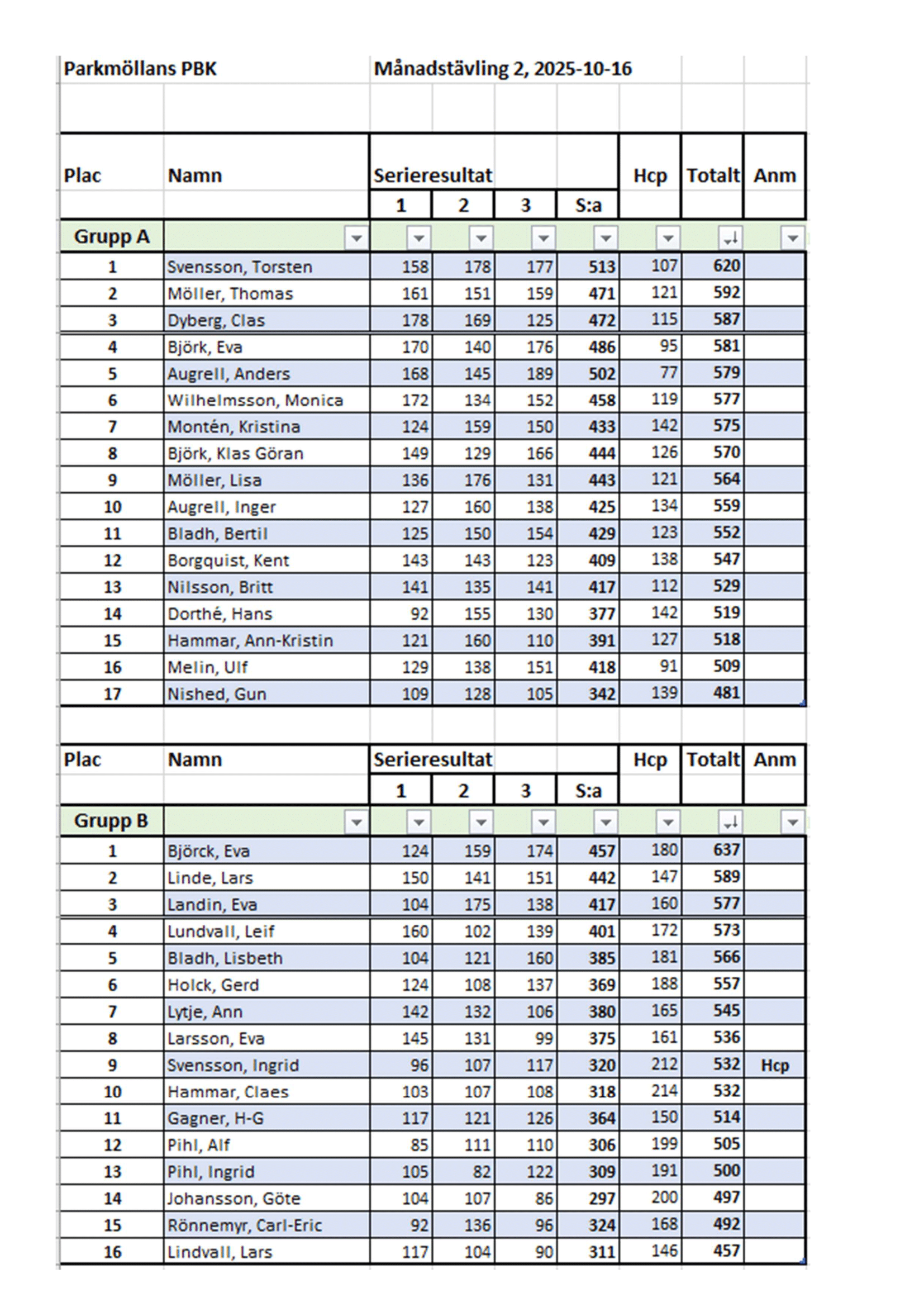 | 17 | Gunilla Oredsson | 142 | 150 | 145 | 437 | 102 | 539 | Hcp | |