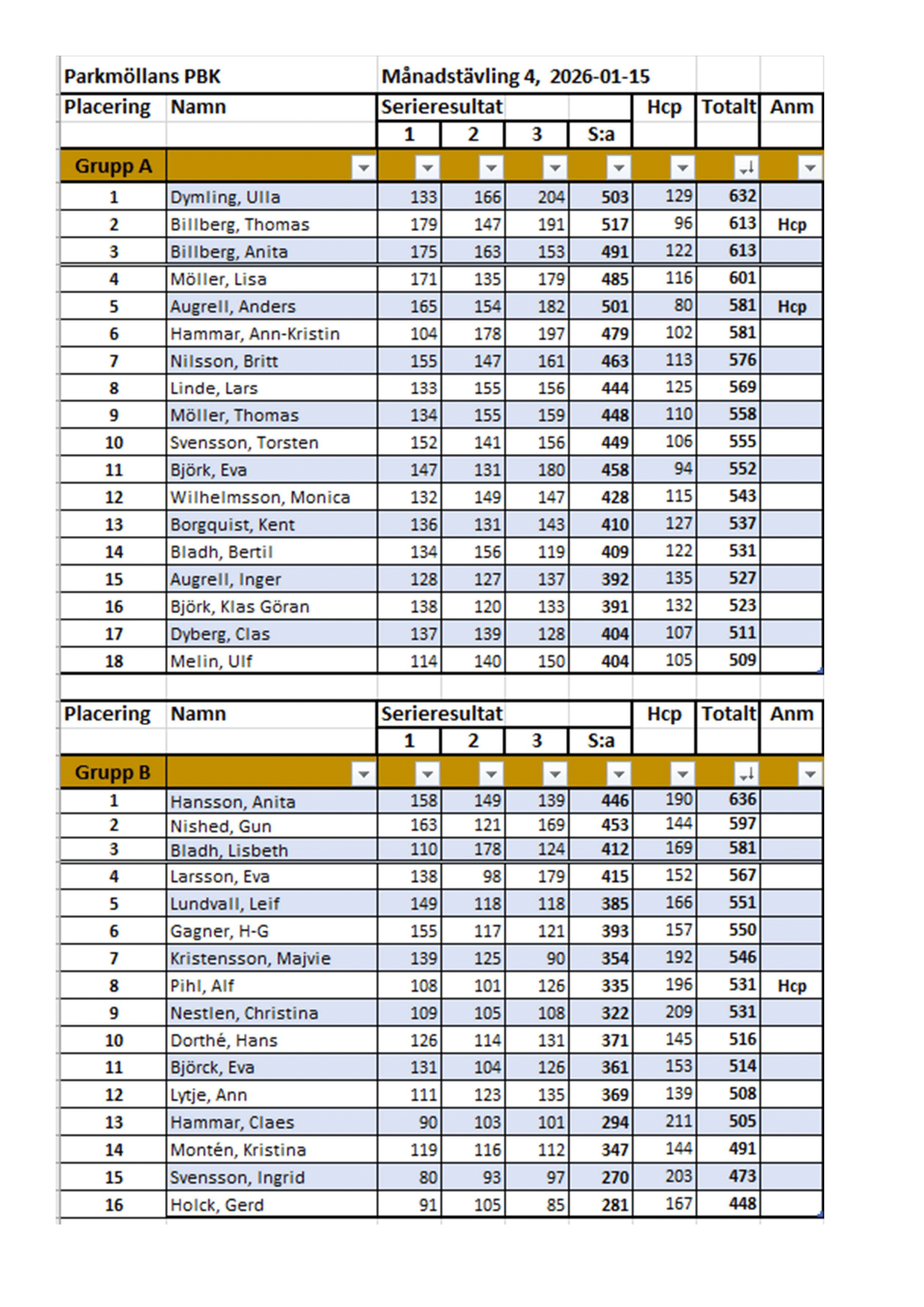 | 12 | Anna-Lena Lindstedt | 176 | 136 | 178 | 490 | 63 | 553 | ||